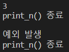 print_n() 함수는 매개변수를 정수형으로 출력하는 코드로써 매개변수가 정수형이 아닌 경우에는 예외가 발생한다. 매개변수로 3이 전달된 경우에는 정상적으로 출력이 됐지만 return 이후의 코드는 실행이 되지 않는 것을 확인할 수 있다. 추가로 매개변수로 정수가 전달된 경우와 문자열이 전달된 경우 모두 finally 부분은 실행되는 것을 확인할 수 있다. 따라서 return 키워드를 만나더라도 finally 부분은 반드시 실행된다는 것을 알 수 있다.