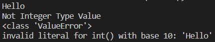 위 코드는 try 구문을 사용하여 예외를 처리하고 있고 except 구문에서는 모든 예외(Exception)에 대한 처리를 하고 있다. 발생한 예외는 이를 저장할 변수(위 코드에서는 exception)에 저장하여 type과 내용을 출력할 수 있다. 위 코드에서 발생한 예외의 타입은 ValueError이므로 코드를 아래와 같이 수정할 수 있다.