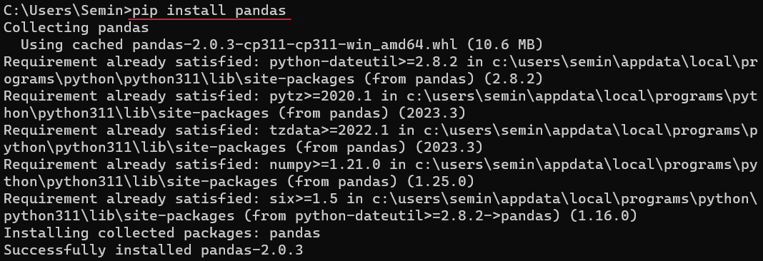 아래 사진에서는 파이썬에서 데이터를 분석할 때 사용하는 패키지인 pandas를 설치해보고 있다.