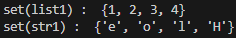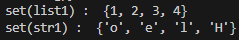 만약 [1, 2, 3, 3, 4]와 같은 리스트나 "Hello"와 같은 문자열이 있다고 가정해보자. 이 두개를 집합으로 만들면 아래와 같은 결과가 반환된다.