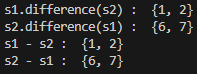 차집합을 구하기 위해서는 difference() 함수를 사용하는 방법과 - 기호를 사용하는 방법이 있고, 결과는 모두 동일하다.